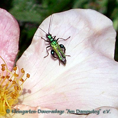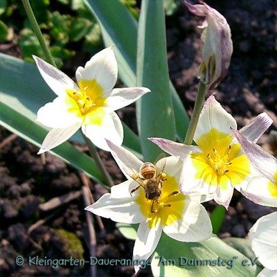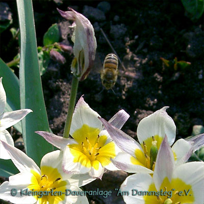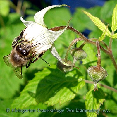 Fazit: Wir Kleingärtner brauchen die Biene, denn ohne sie fehlt ein lebenswichtiger Teil der Natur in unseren Gärten. Leider verschwanden ganze Bienenvölker, auch welche die zunächst noch gesund erschienen, aus unseren Gärten. Die Fachleute suchen noch nach Gründen und Erklärungen für dieses Bienensterben. Vermutlich ist es ein zusammen wirken verschiedener Faktoren. Einer davon ist die Varroa-Milbe, die in jedem Volk Infektionen auf die Bienen überträgt. Allerdings: die "Varroa" läßt sich professionell durch unseren Vereinsimker bekämpfen. Weitere Faktoren wie Monokultur, chemische Pflanzenschutzmittel oder der Einfluß von Gen-Mais können für unsere Anlage ausgeschlossen werden.